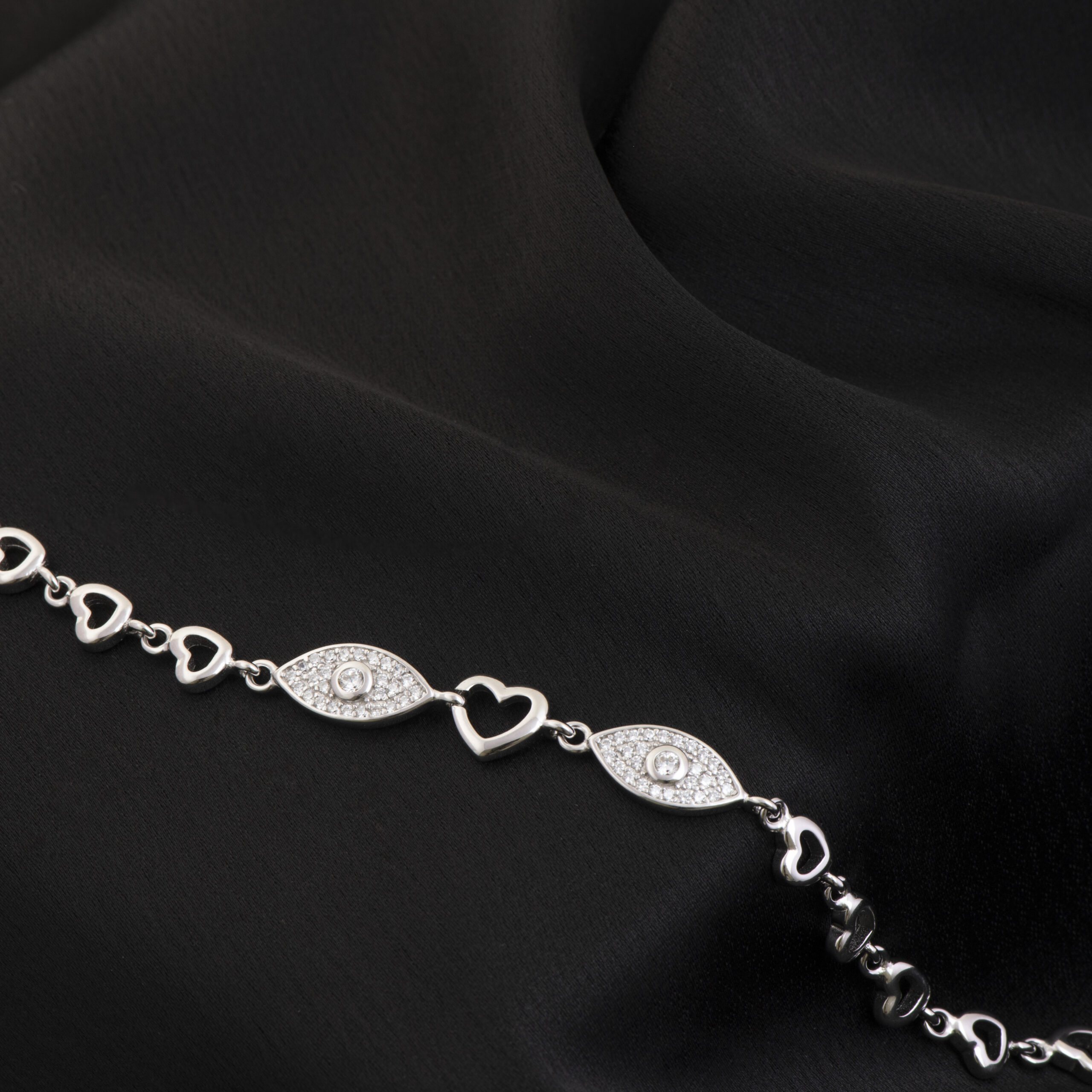 The Angel’s Eyes Heart Bracelet from Izhar features a graceful heart design linked with two diamond-studded eyes on either side to create a beautiful illusion. Crafted in 92.5 sterling silver, this piece is a timeless work of art.