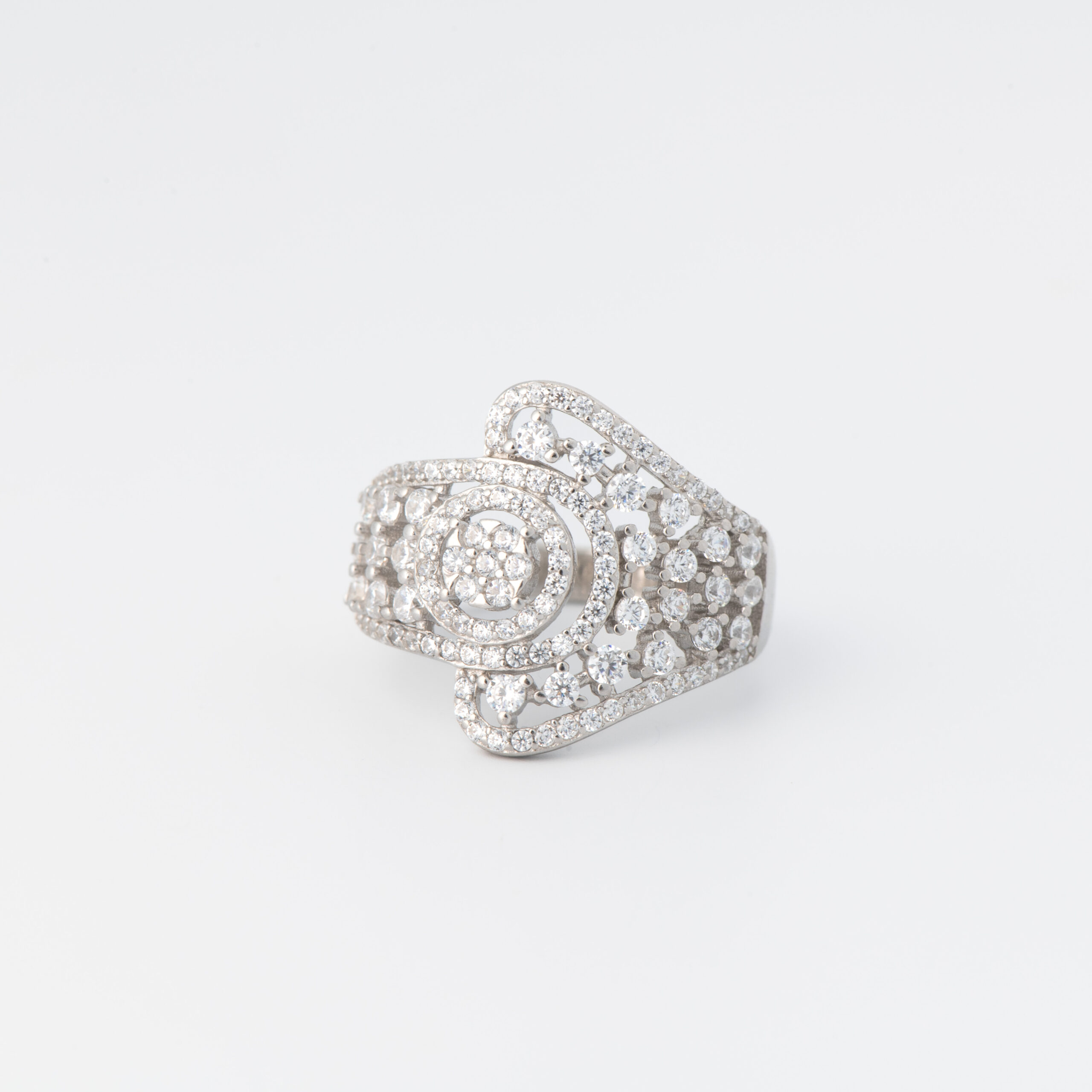 Designed to command attention with grace, Izhar’s Contemporary Halo Statement Ring features layered diamond-studded curves that flow into a radiant circular centre. The wide silver band adds depth and drama while keeping the look refined and elegant. A perfect blend of bold brilliance and timeless sophistication for occasions that deserve a little extra glow.