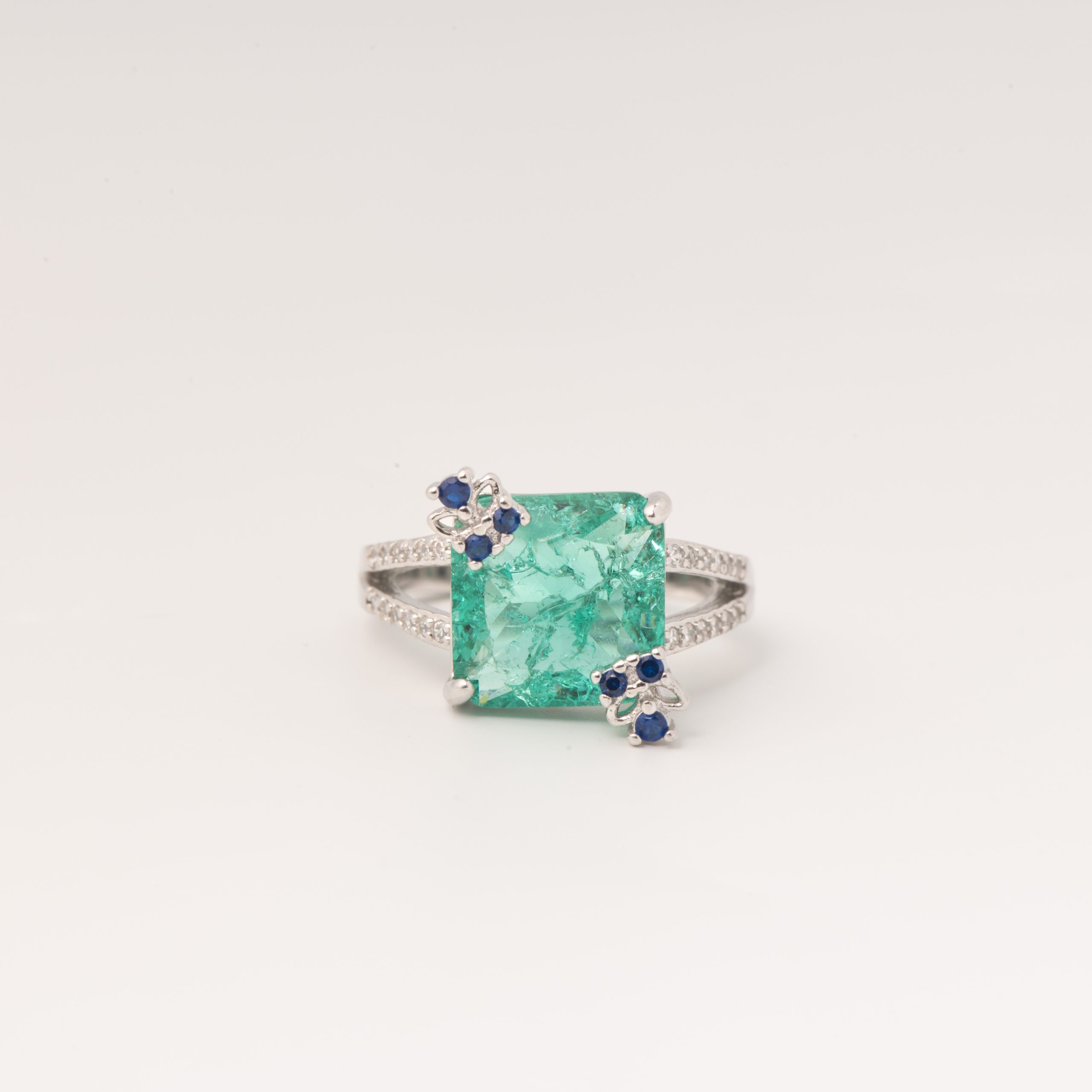 Regal and refined, the Emerald Crest Ring from Izhar features a striking emerald-toned centre stone framed by subtle diamond accents along the shoulders. The elevated square silhouette and clean silver lines create a look that feels confident yet elegant, especially made for moments when quiet luxury says it all.