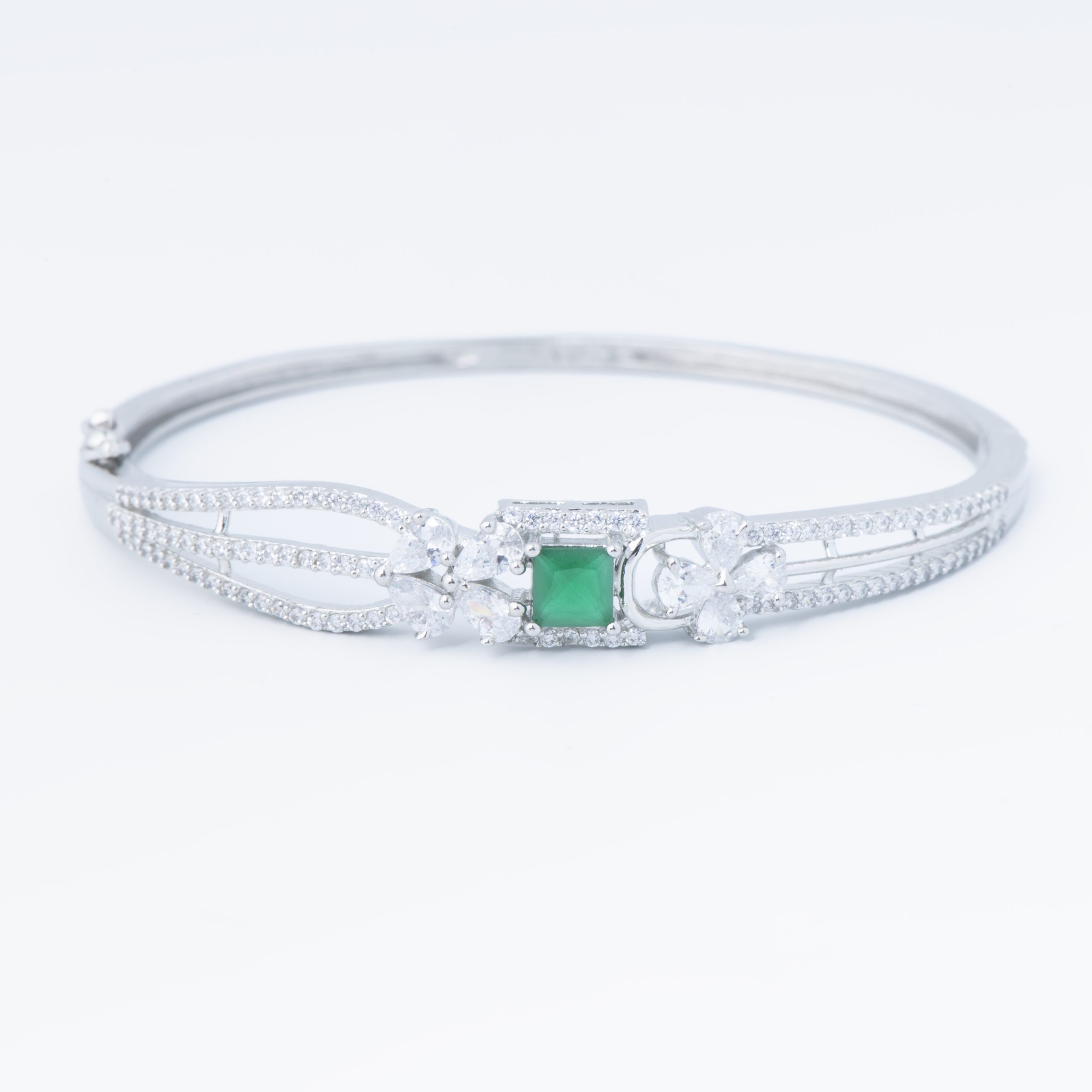 Gracefully designed with a touch of modern elegance, Izhar’s Emerald Flow Silver Bracelet features a vivid emerald centre framed by fluid diamond-studded lines. The delicate petal-like accents add movement and softness, creating a perfect balance of structure and sparkle. Crafted in 92.5 sterling silver, this bracelet is made for moments when subtle sophistication makes the strongest statement.