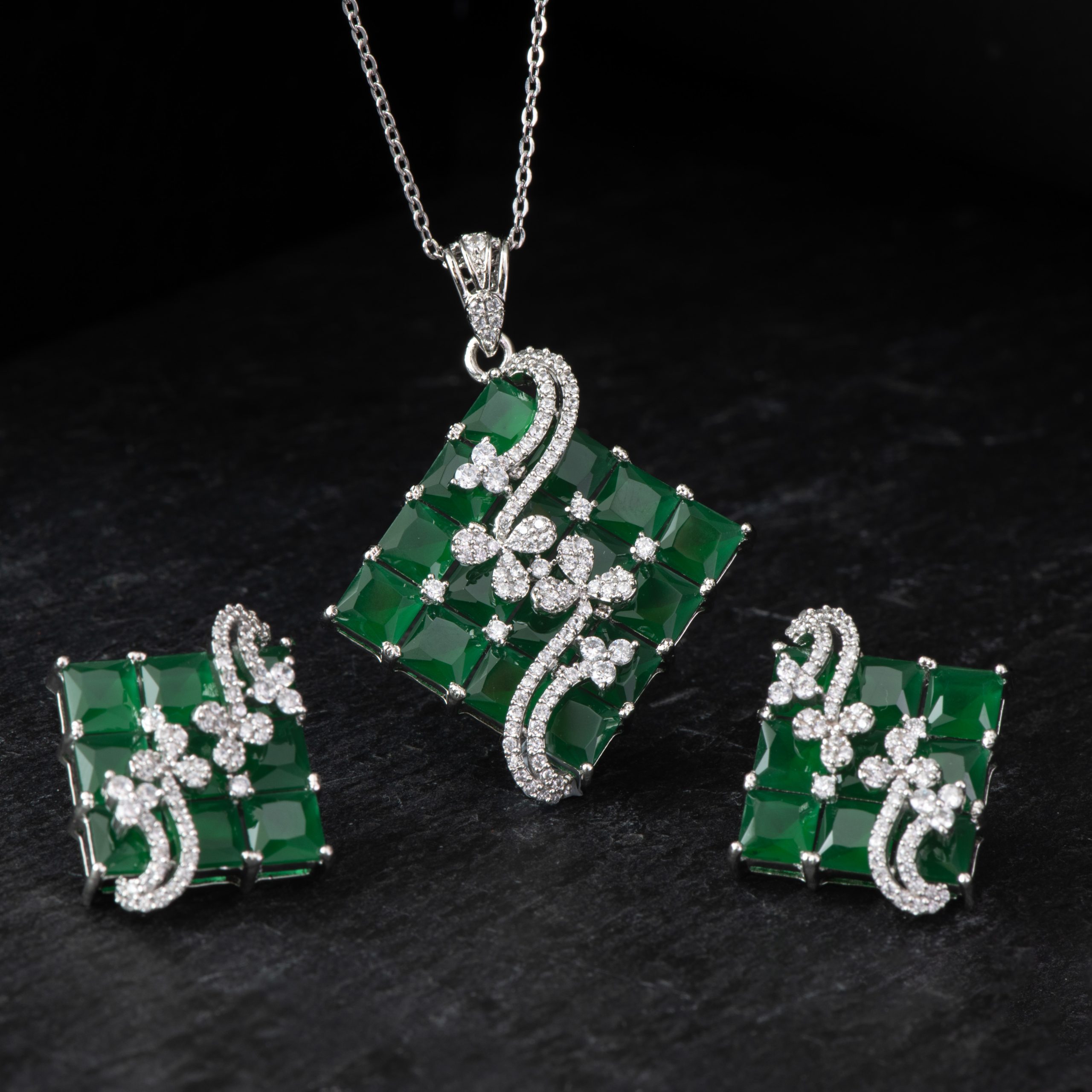 Immerse yourself in the artistic experience of Izhar’s Emerald Mosaic Pendant Set. Its beauty? The grid of lush green emeralds adorned with a diamond-studded floral swirl brings structure and grace together. The result is a striking fusion of geometry and sparkle, a masterpiece that sits beautifully at the heart.