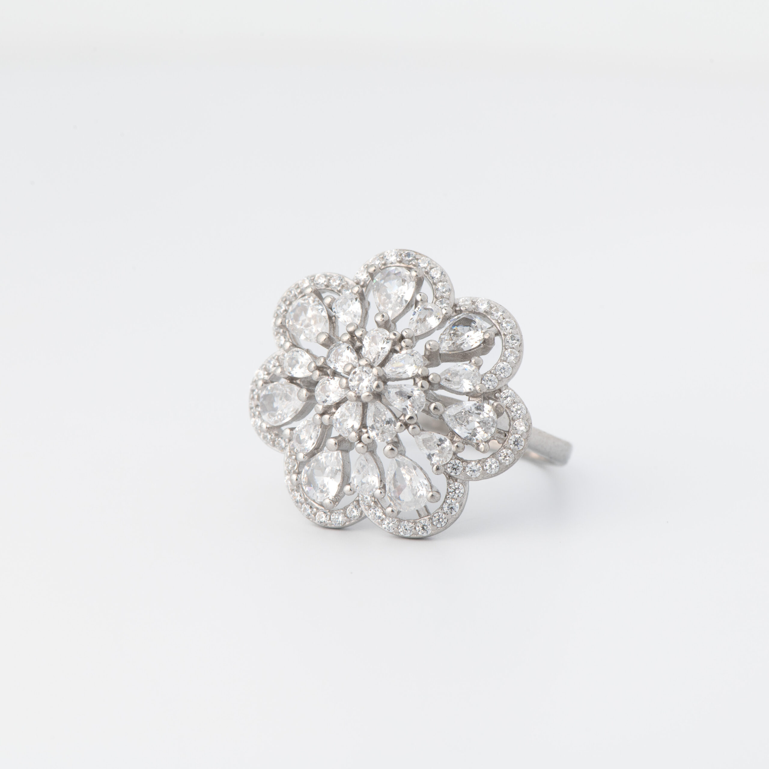 Izhar’s Eternal Blossom Statement Ring gracefully unfolds like a flower in full bloom. This elegant piece features layers of shimmering stones forming delicate petals around a radiant centre, creating a design that feels both unique and timeless. It pairs beautifully with traditional wear for moments that call for effortless elegance.
