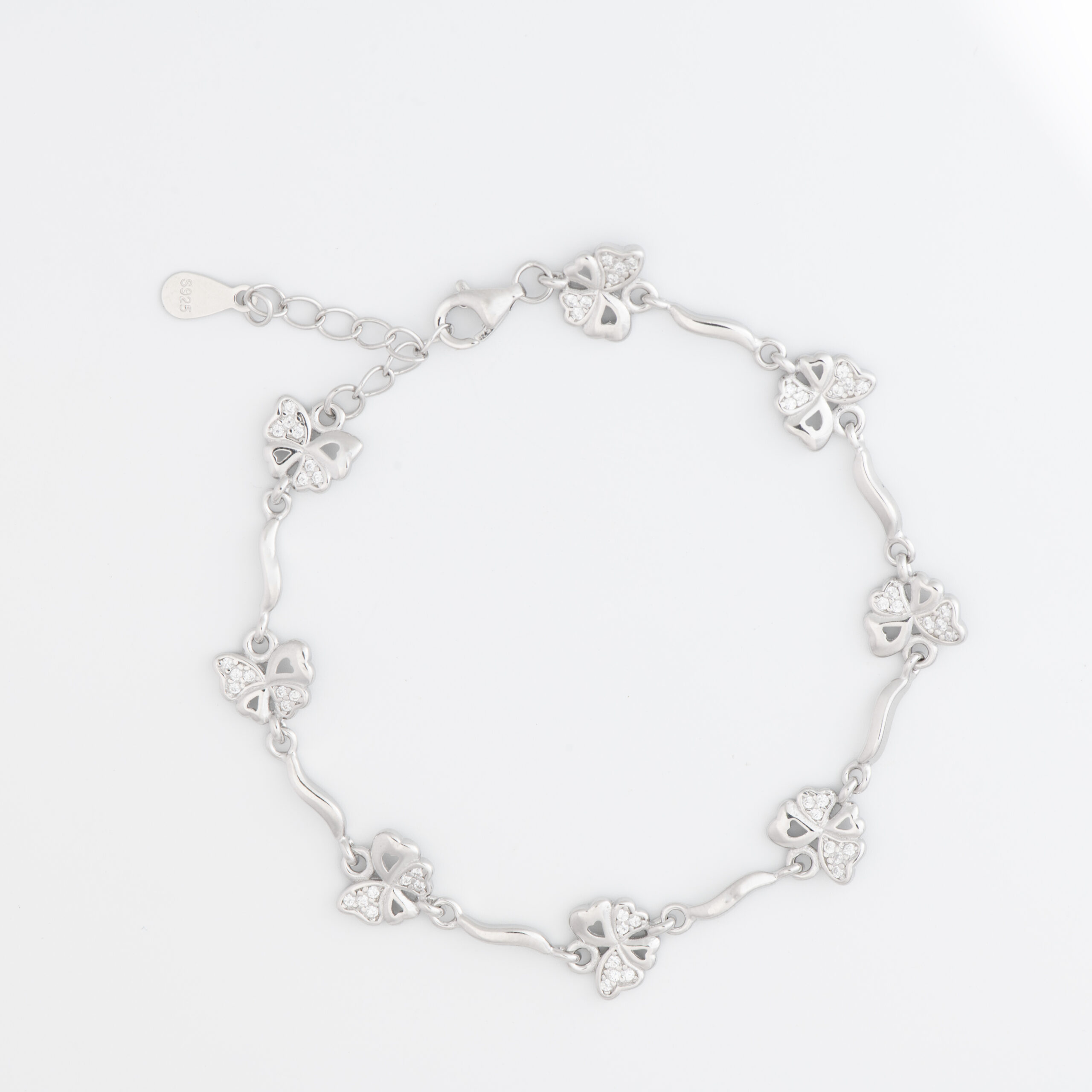 The Flutter Bloom Bracelet features graceful butterfly charms kissed with subtle shimmer, creating a playful silver piece that feels light, joyful, and full of charm.