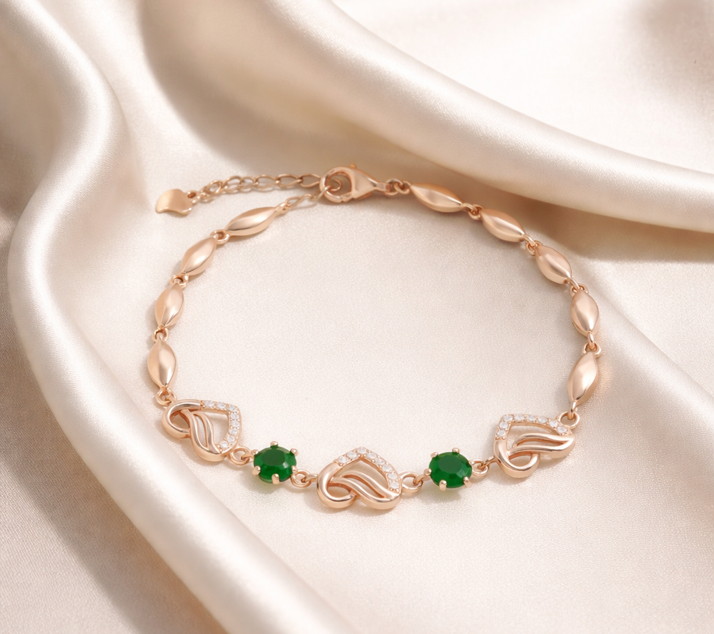 Soft golden heart knots and vibrant emerald stones come together to create this graceful silver bracelet from Izhar, blending romance with a touch of royal charm. The Gold & Emerald Love Bracelet effortlessly adds warmth, colour, and elegance to both everyday looks and festive moments.