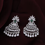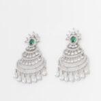 A celebration of heritage glamour, Izhar’s Imperial Emerald Chandbali Earrings feature layered arcs of shimmering stones crowned with a rich emerald-toned centre. The intricate tiers and delicate dangling drops create graceful movement and dramatic sparkle, making this pair perfect for festive evenings, weddings, and moments that call for regal elegance.