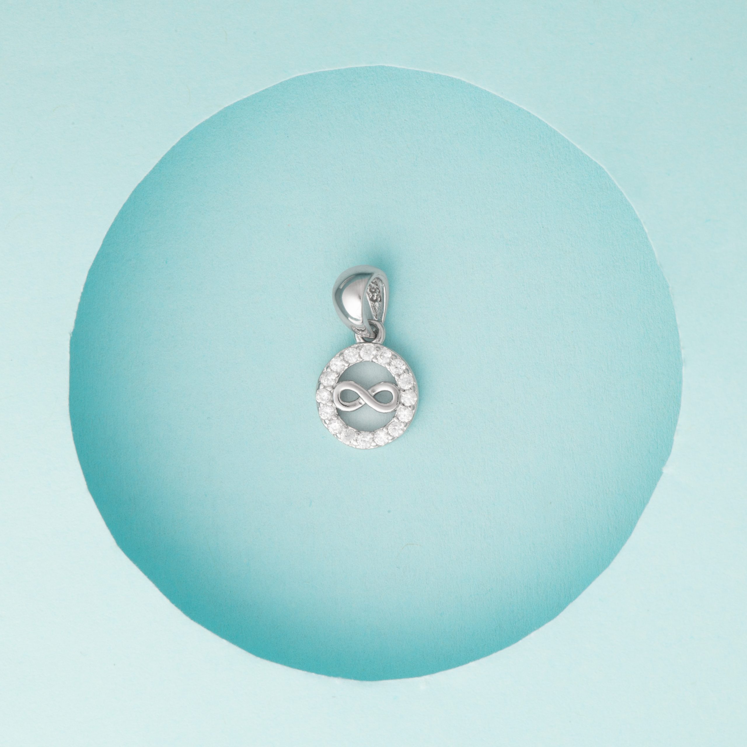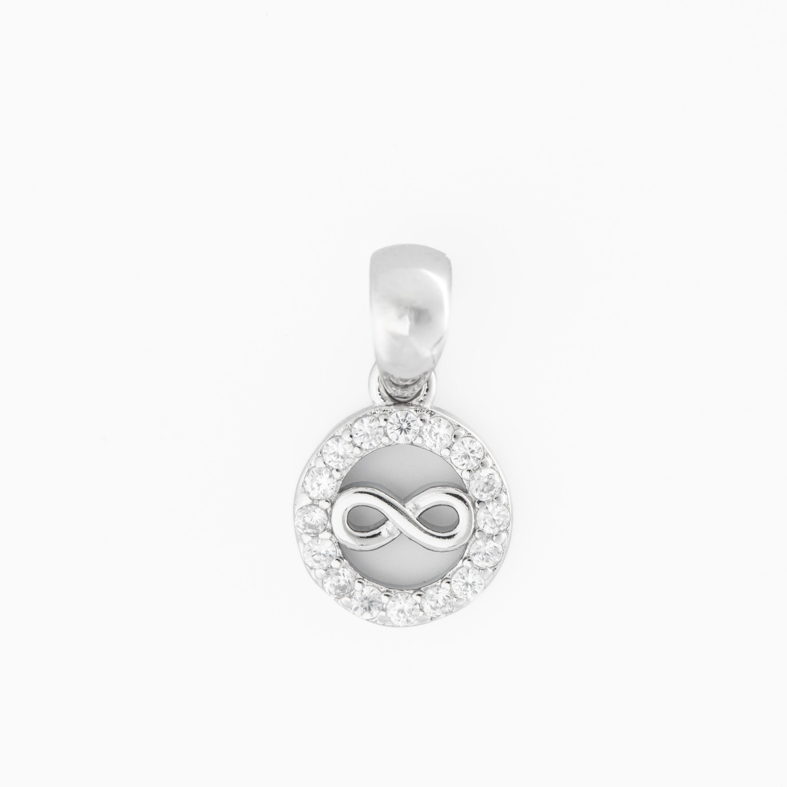 - Design: Circular diamond-studded charm, enclosing a silver infinity symbol