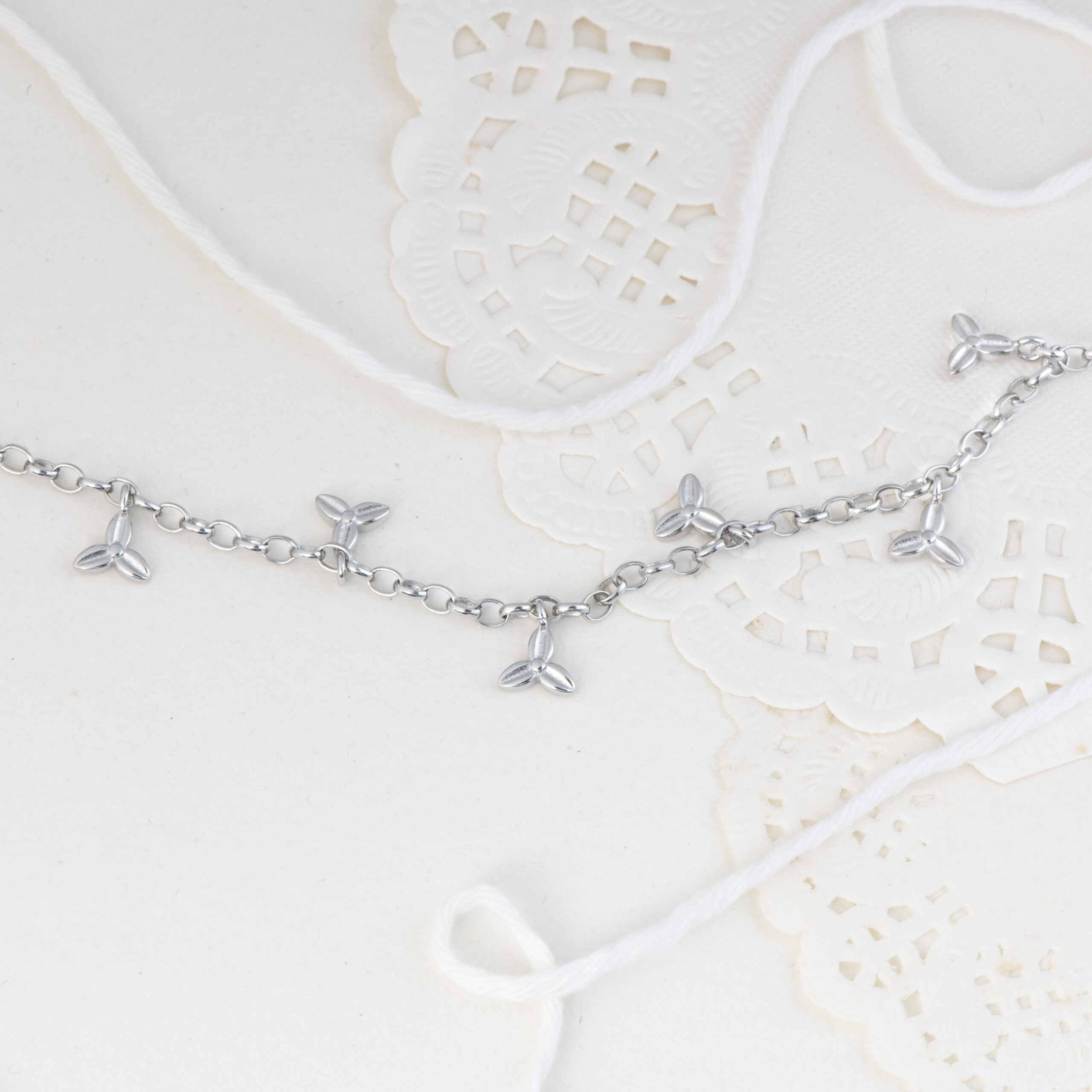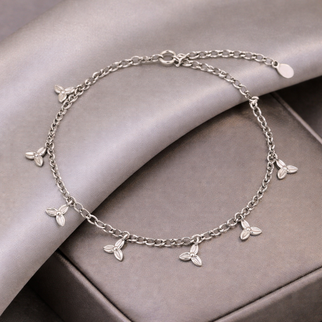 The Little Leaves Charm Bracelet from Izhar features a delicate silver chain adorned with tiny leaf charms that sway gently with every movement. Light, playful, and effortlessly charming, this silver bracelet is designed to bring a fresh touch of elegance to everyday wear.
