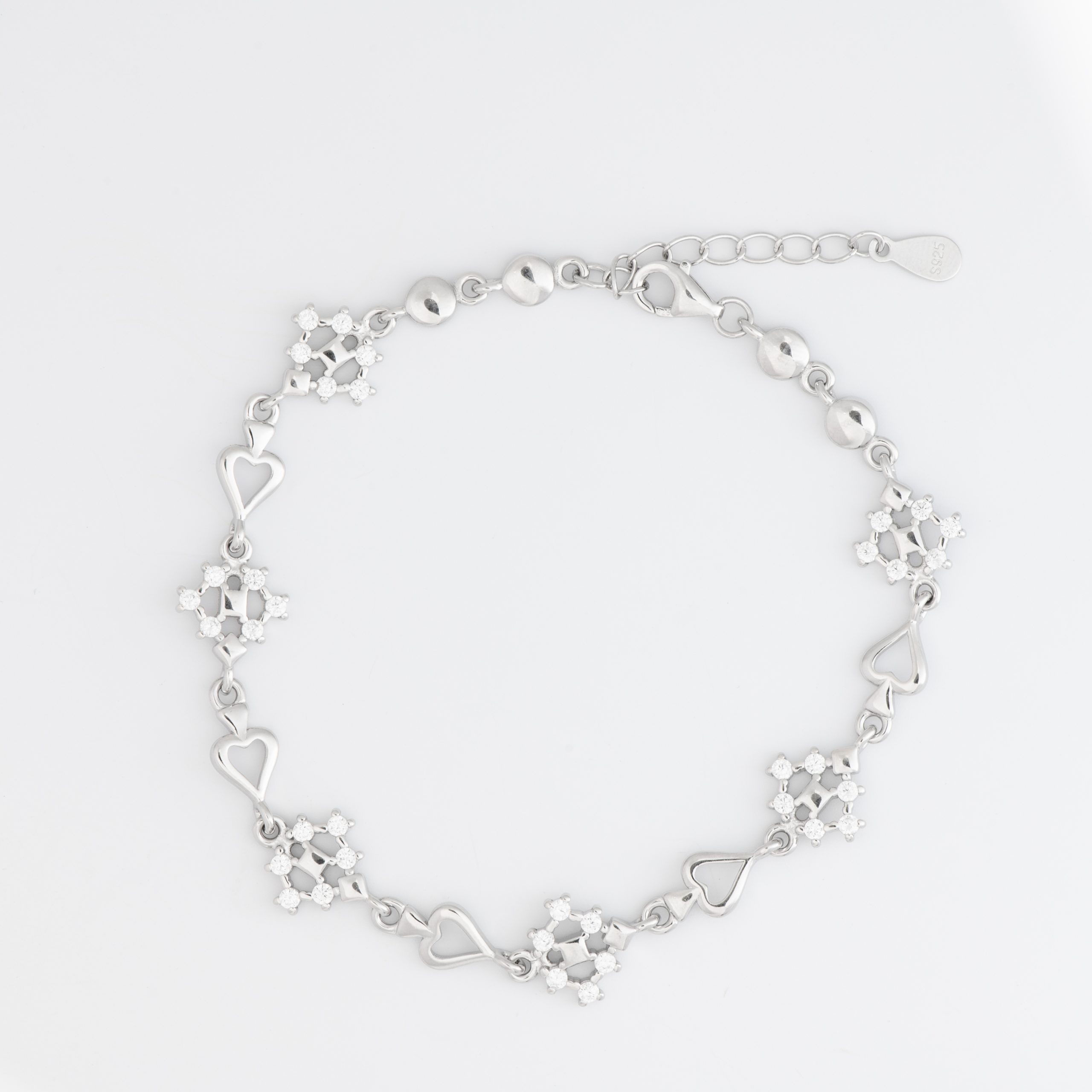 The Mosaic Statement Bracelet from Izhar features a graceful sequence of heart-shaped links and geometric diamond clusters, brought together in a design that feels structured yet fluid. Crafted in 92.5 sterling silver, it’s a striking balance of detail and elegance to stand out effortlessly, whether worn alone or layered.