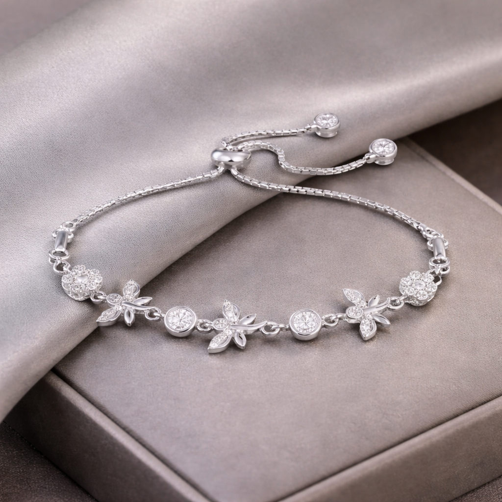 Izhar’s Mystic Butterfly Adjustable Bracelet features delicate butterfly motifs interwoven with subtle diamond accents, creating a design that feels light, graceful, and full of movement. Crafted in 92.5 sterling silver, this adjustable bracelet adds a soft touch of charm to your everyday style while remaining effortlessly elegant.