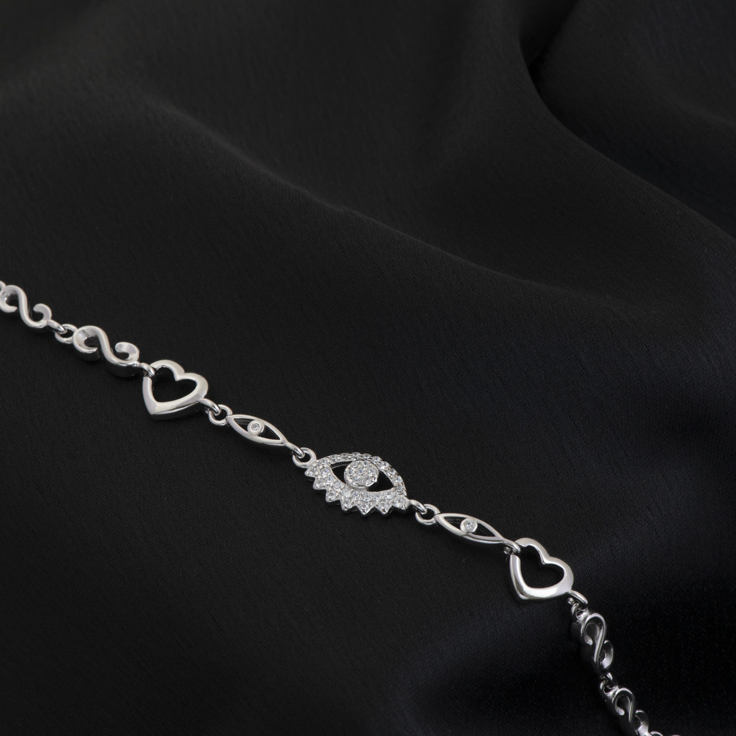 The Mystic Eye Charm Bracelet features a striking evil-eye-inspired centre charm, accented with subtle sparkle for a look that blends style with symbolic meaning. Crafted in silver, it’s a trendy yet timeless piece made to stand out effortlessly.
