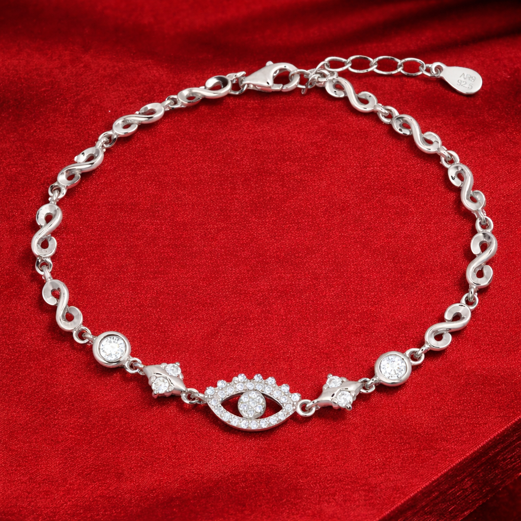 The Mystic Eye Statement Bracelet from Izhar features a striking evil-eye motif set with delicate diamond accents, symbolising protection and positive energy. Framed by fluid silver links and subtle sparkle, this piece blends meaning with modern elegance. Your everyday companion.