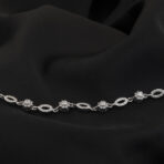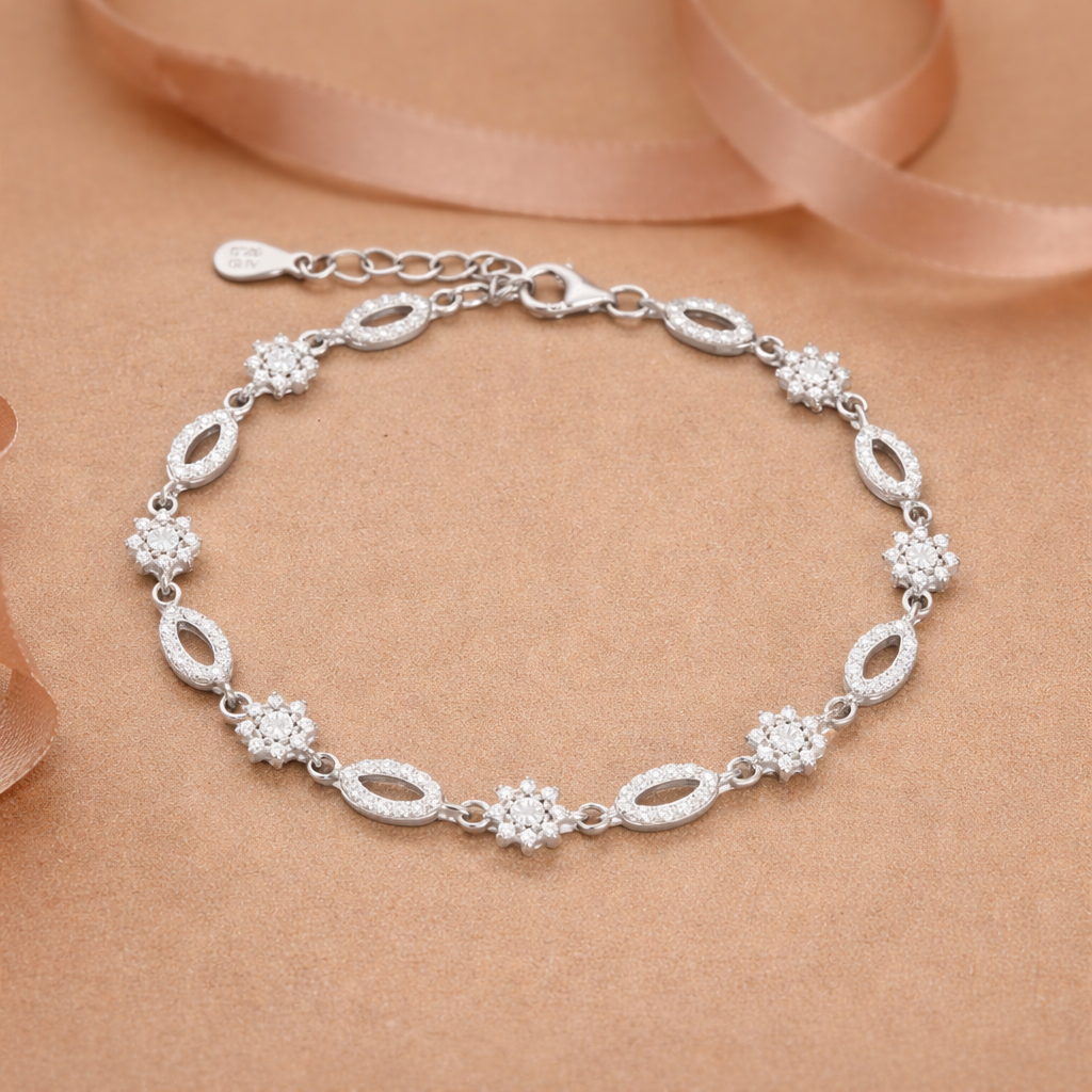 Delicate petal-inspired motifs paired with shimmering diamond accents come together in this graceful silver bracelet. Designed to catch the light subtly against deeper tones, it’s a piece that feels quietly luxurious. Perfect for evenings when understated elegance speaks the loudest.