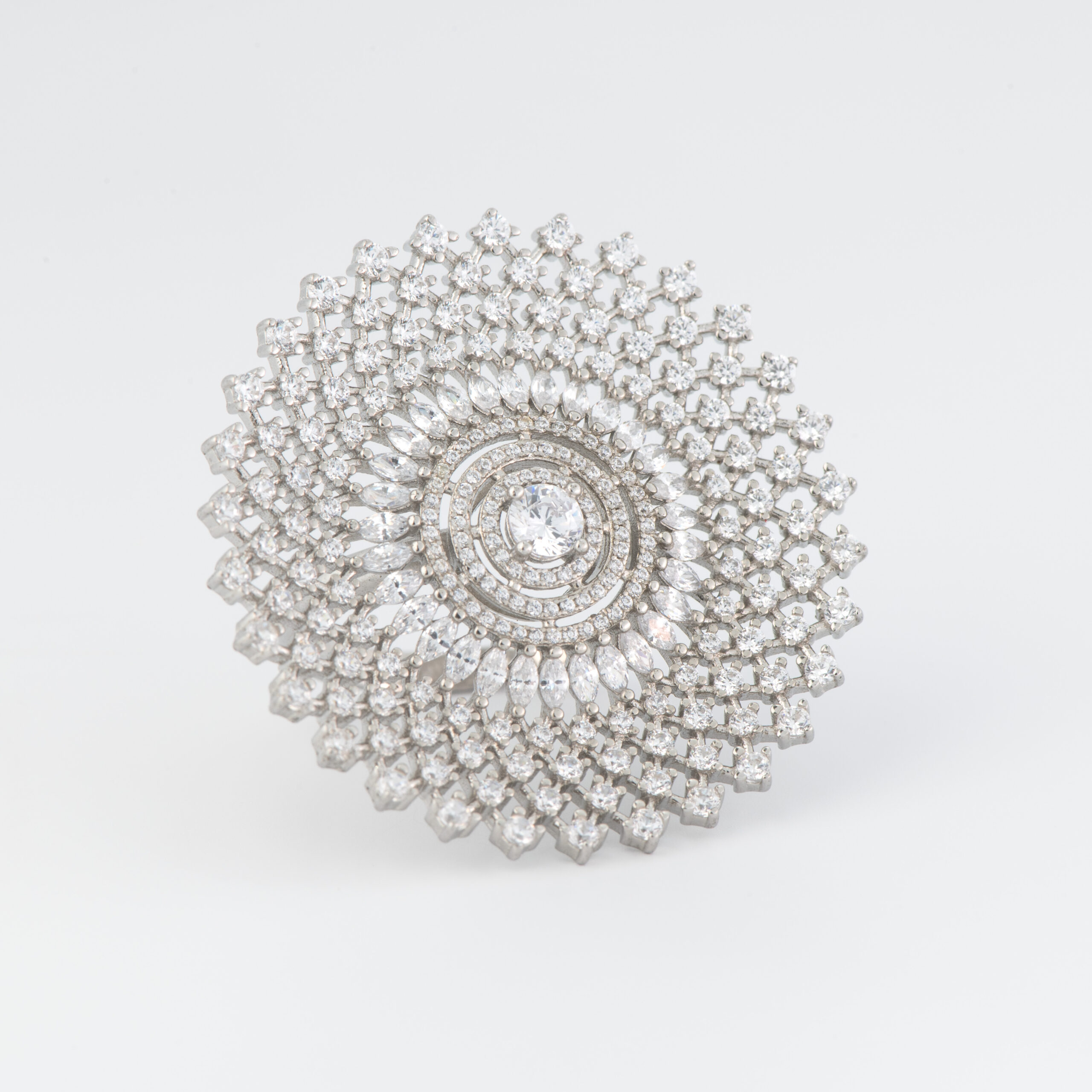 Don’t just shine, steal the moment with Izhar. This Radiant Bloom Statement Ring from Izhar unfolds like a sparkling flower in full bloom, with delicate layers of shimmering stones radiating from a luminous centre. Designed to feel grand yet graceful, this piece delivers a perfect blend of elegance and timeless charm.
