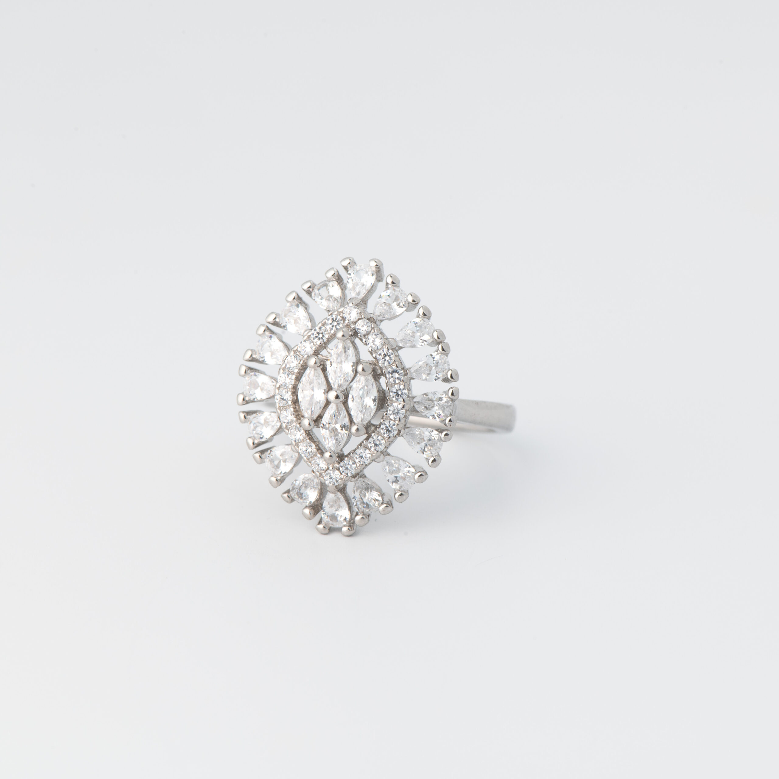 Izhar’s Radiant Petal Bloom Ring draws inspiration from the beauty of a flower in full bloom. This 92.5 sterling silver ring features delicate marquise stones forming graceful petals around a shimmering halo centre. Light dances across every detail the ring holds to create a look that feels soft yet striking, perfect for moments when you want elegance to blossom effortlessly.