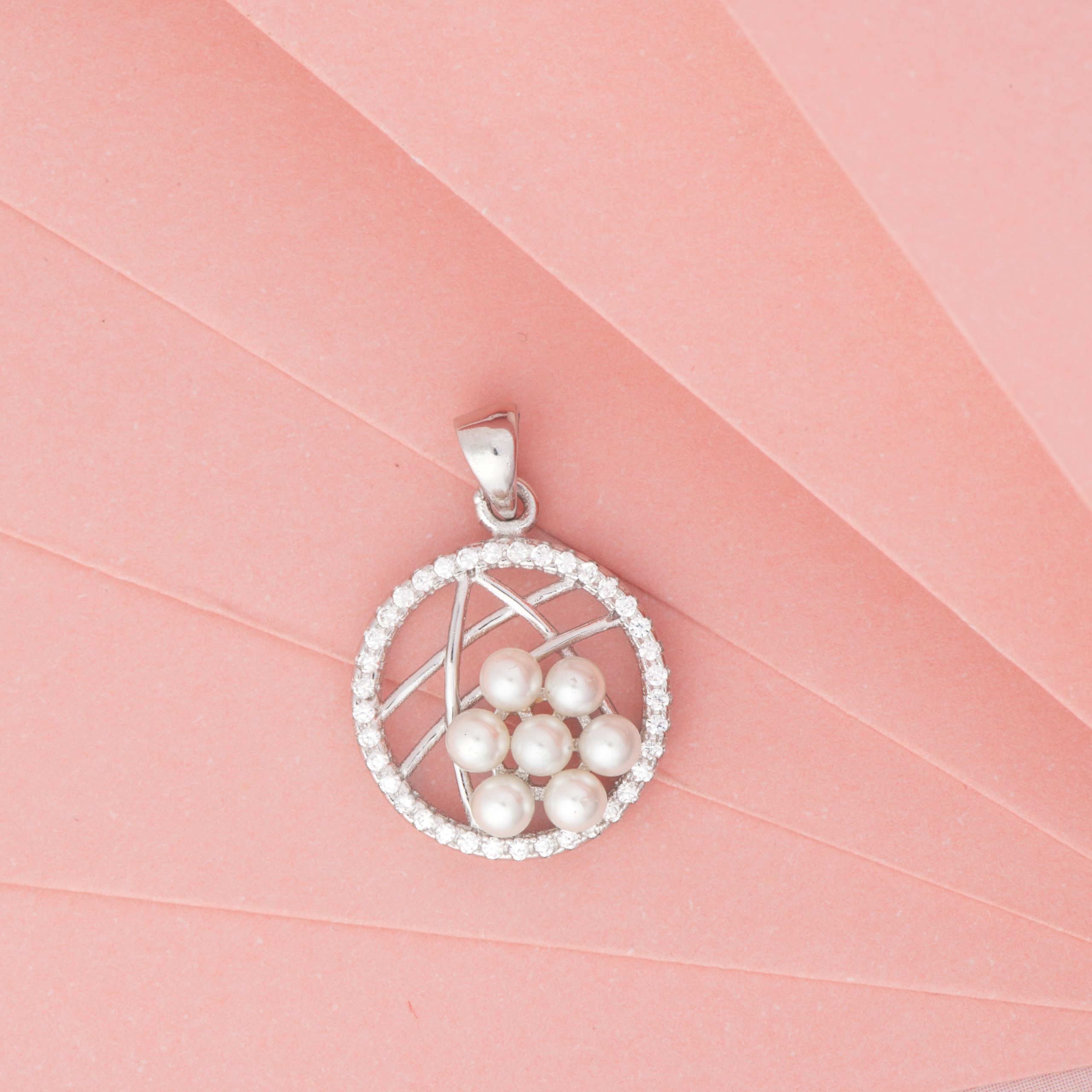 - Design: Delicate circular frame lined with diamonds, enclosing a cluster of soft pearls arranged over a criss-cross lattice design