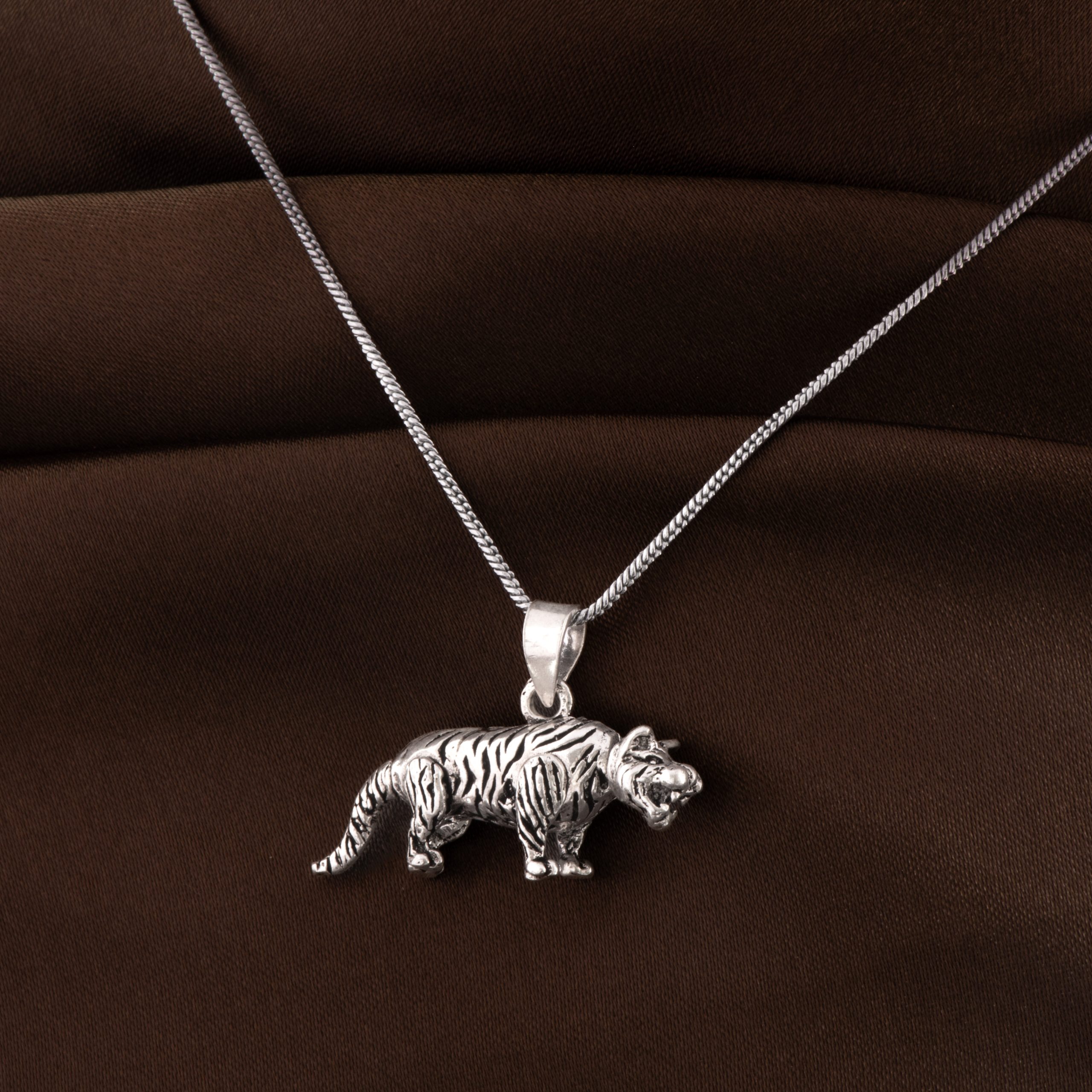 - Design: Silver tiger-shaped pendant charm featuring bold textured stripes in a lifelike sculpted form.