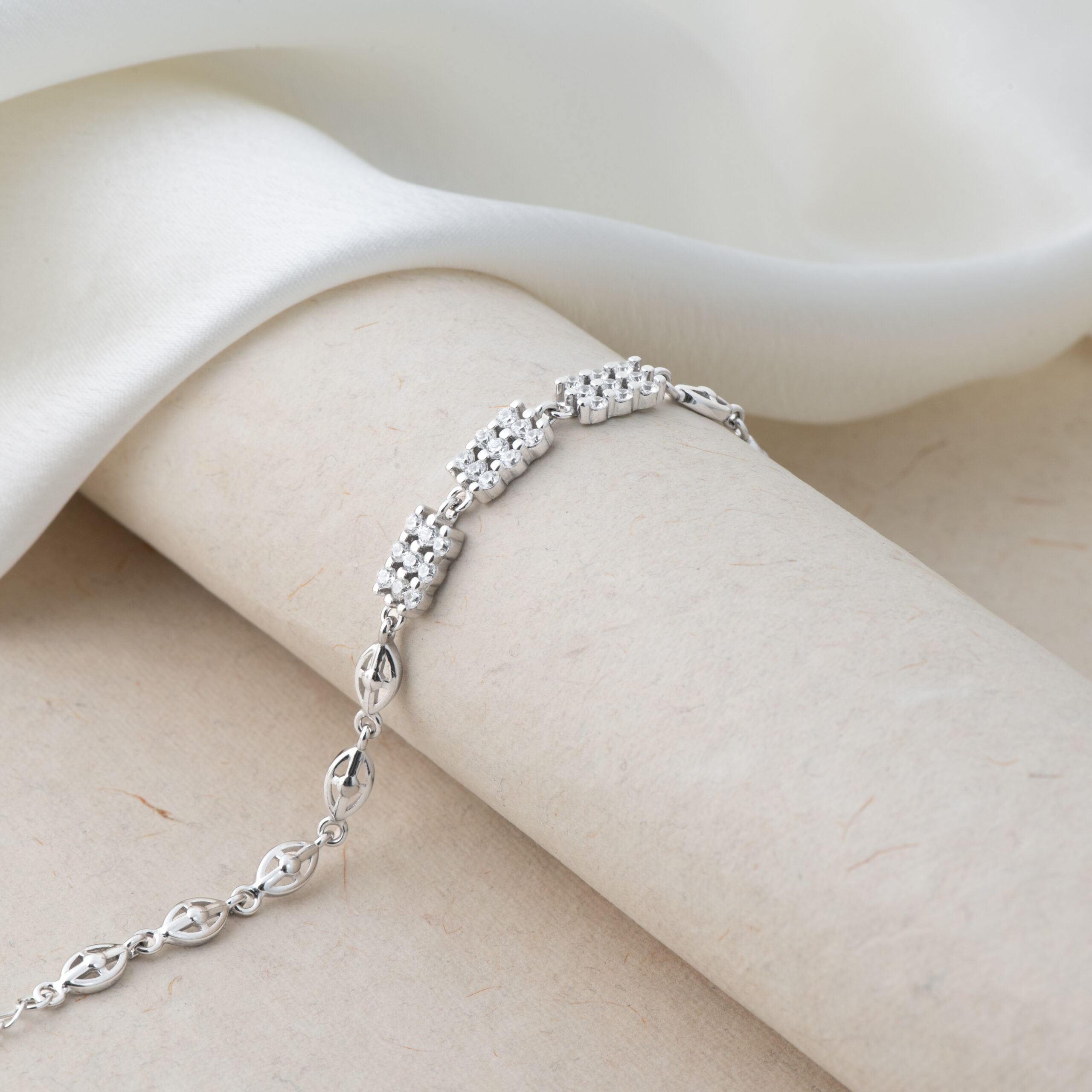 The Shimmer Petal Chain Bracelet features floral-inspired links touched with subtle sparkle, creating a flowing design that feels light and graceful on the wrist. Crafted in 92.5 sterling silver, it’s perfect for effortless, everyday elegance.